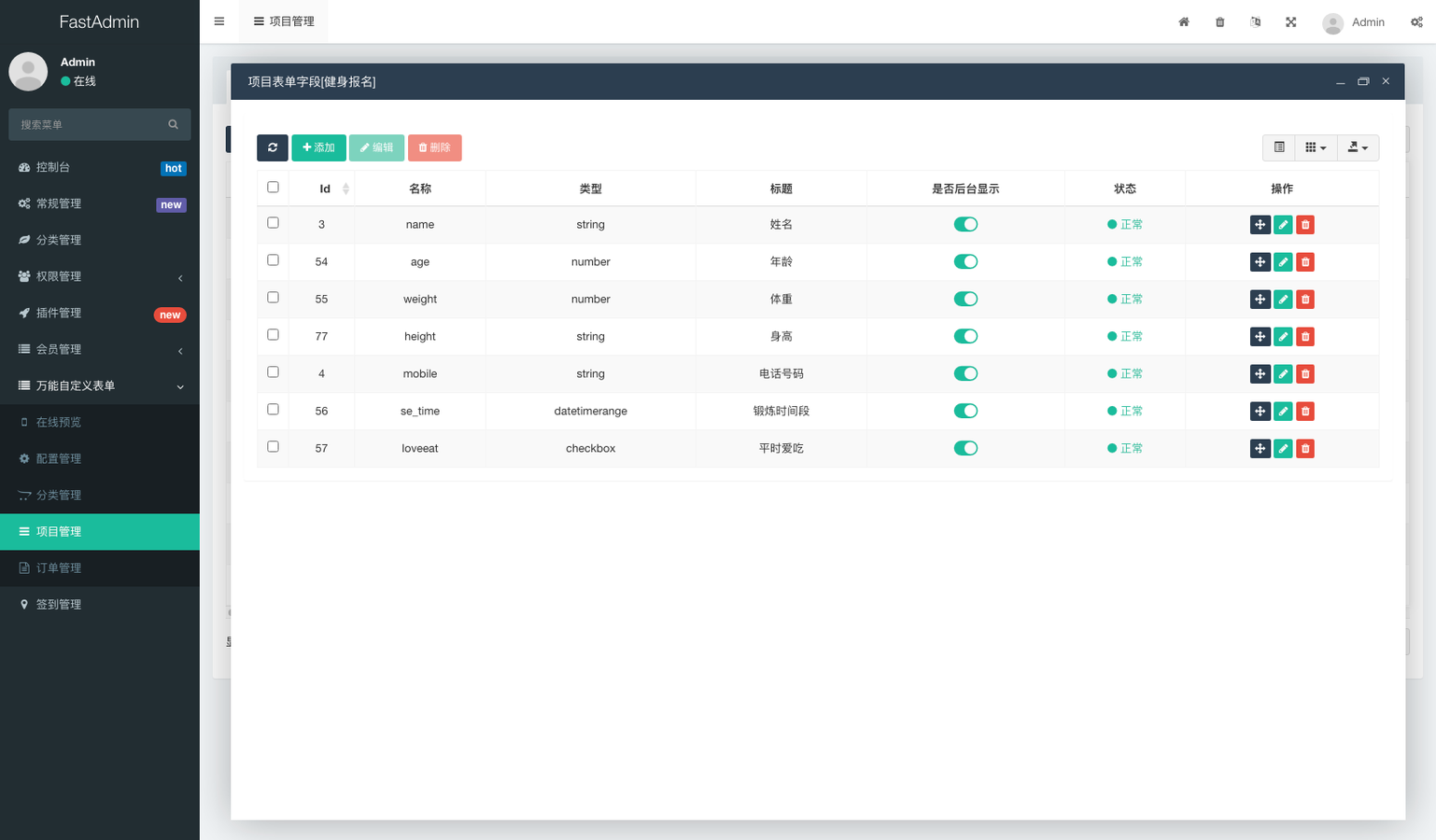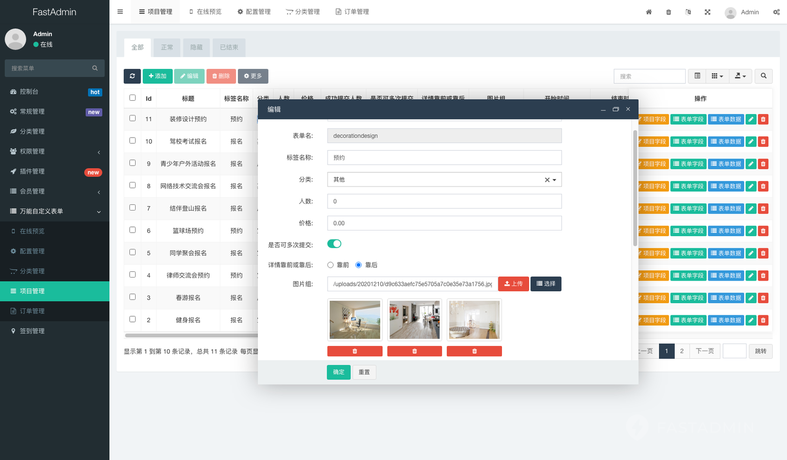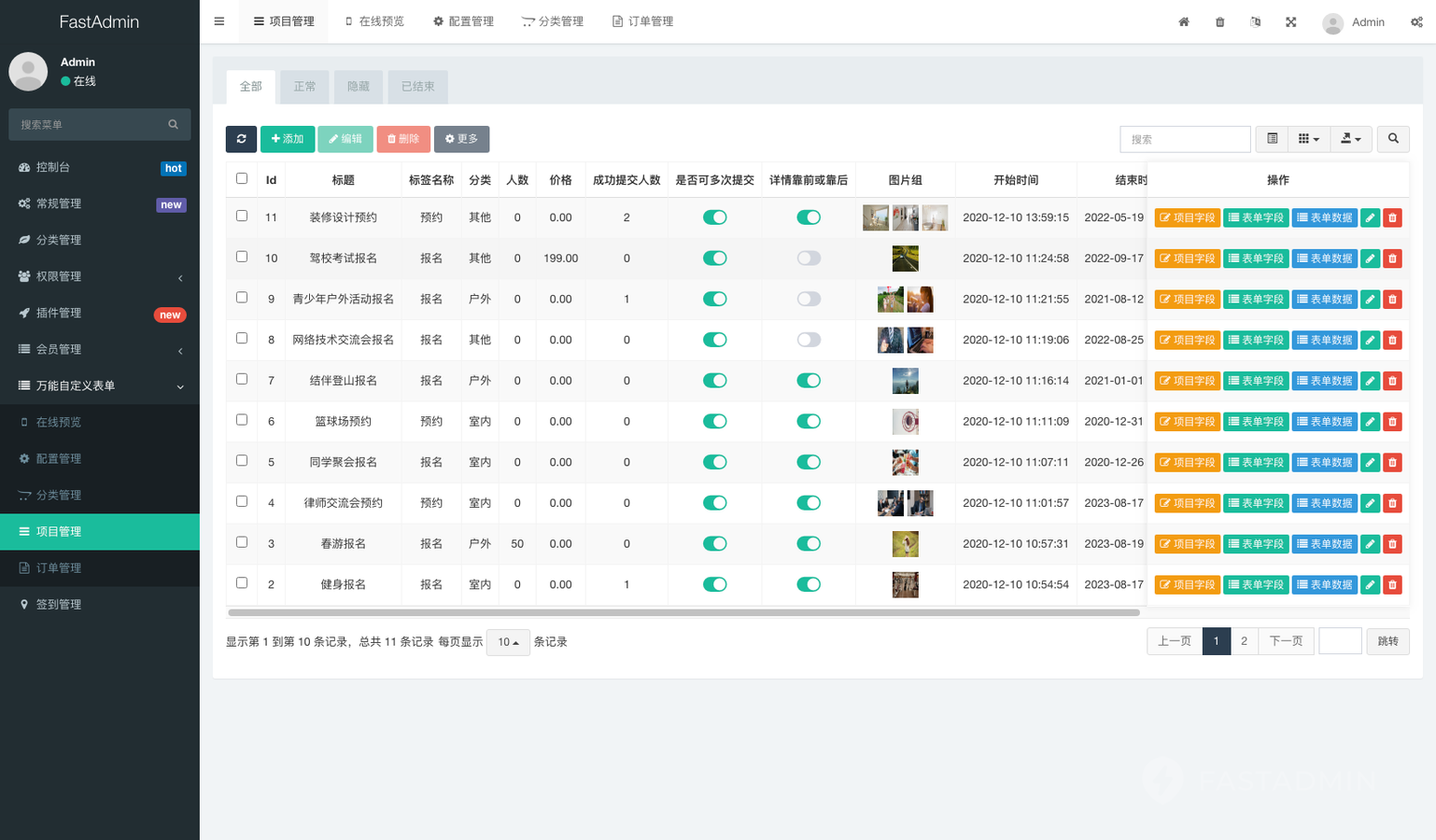 后台功能操作简单,支持多创建多个活动、报名、表单项目,每个项目拥有自定义配置