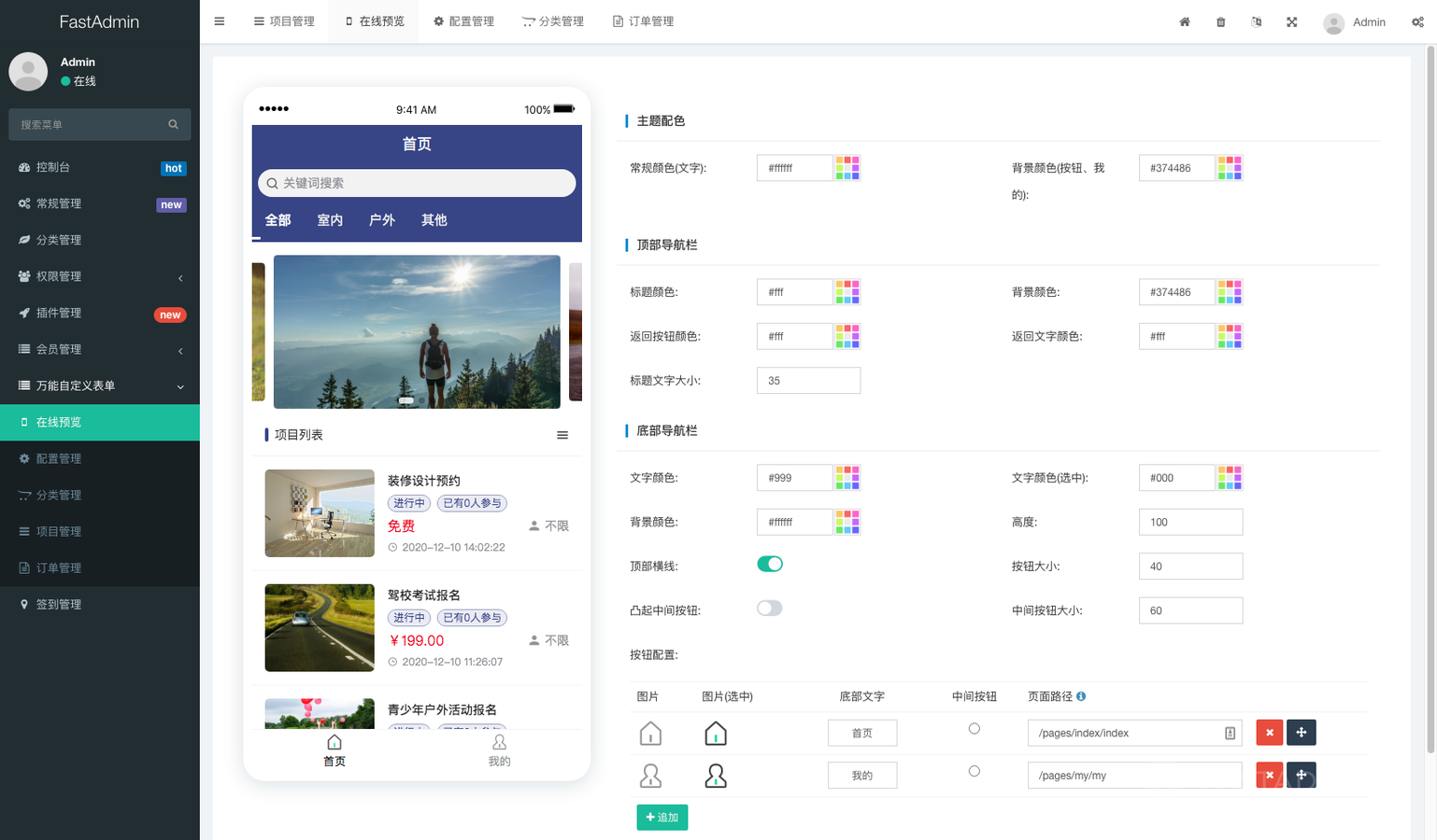 支持后台配置移动端颜色、背景、文字等样式,支持自定义导航栏,支持后台实时预览