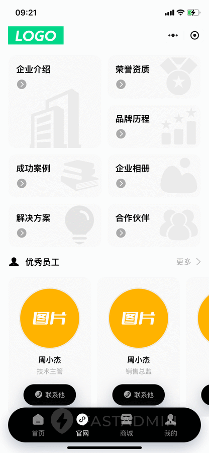 官网可展示企业logo、栏目(栏目可自定义)、企业推荐的优秀员工、企业推荐的资讯。