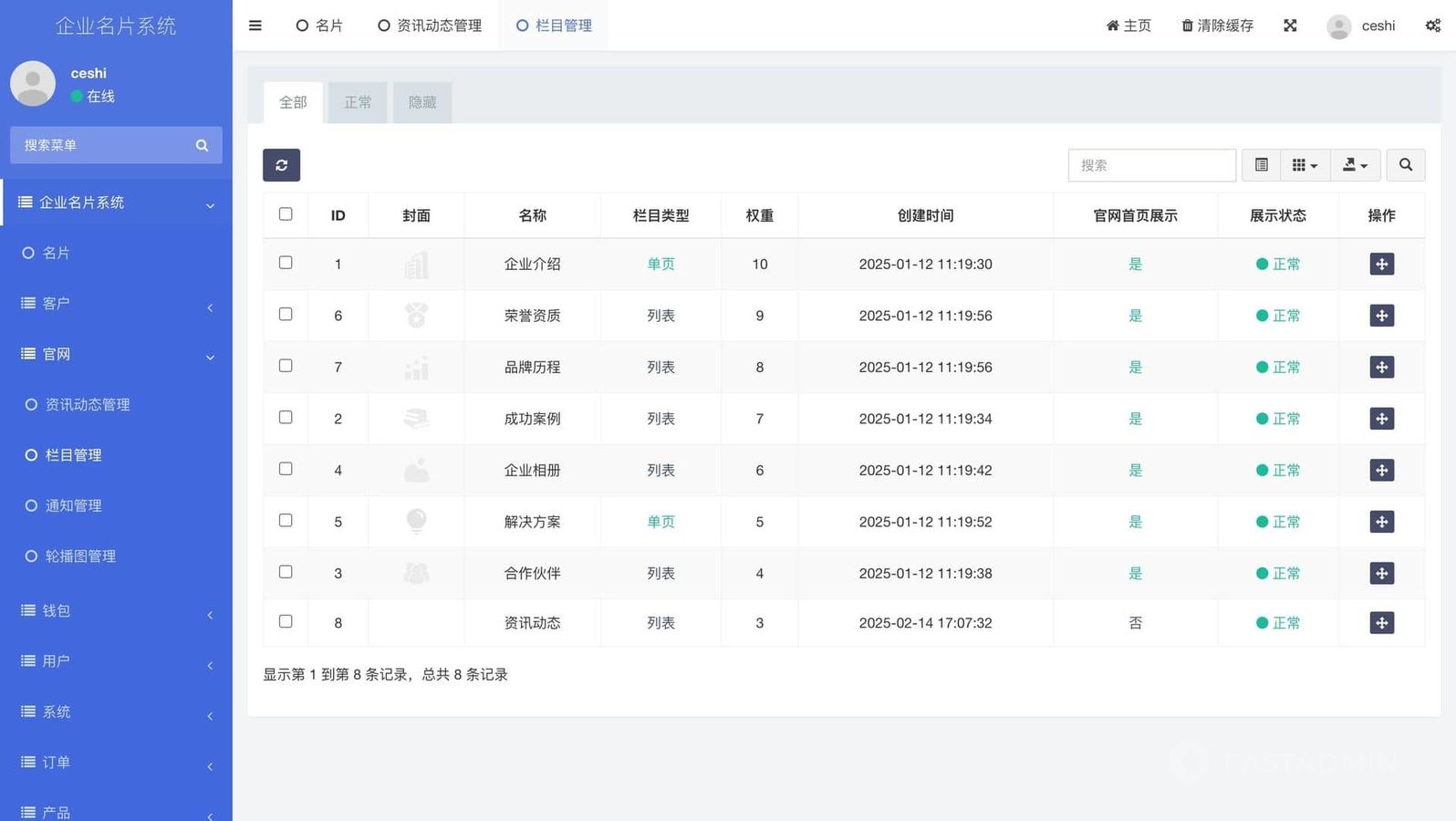 支持自由添加、删除和排序官网栏目,如:公司介绍、相册、新闻动态等,满足不同业务需求,目前支持列表和单页模型。