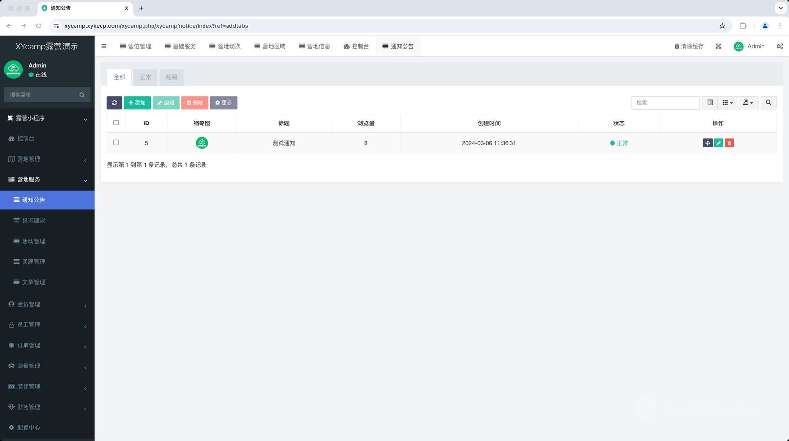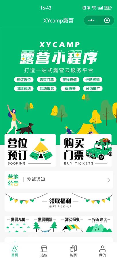 营地服务模块包含通知公告、投诉建议、活动管理、团建管理、文章管理功能
