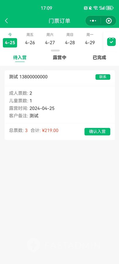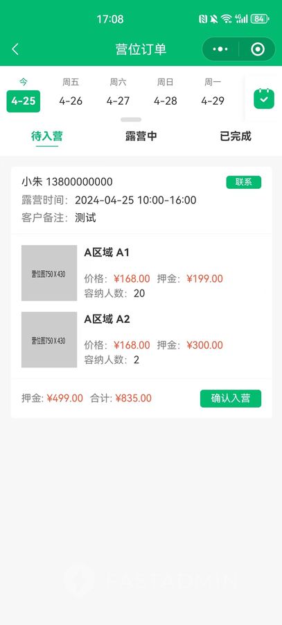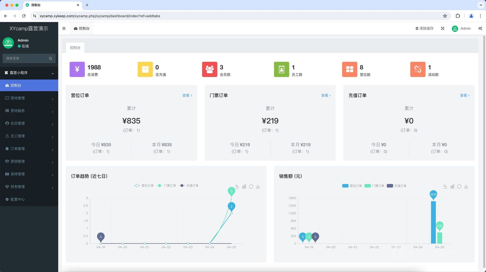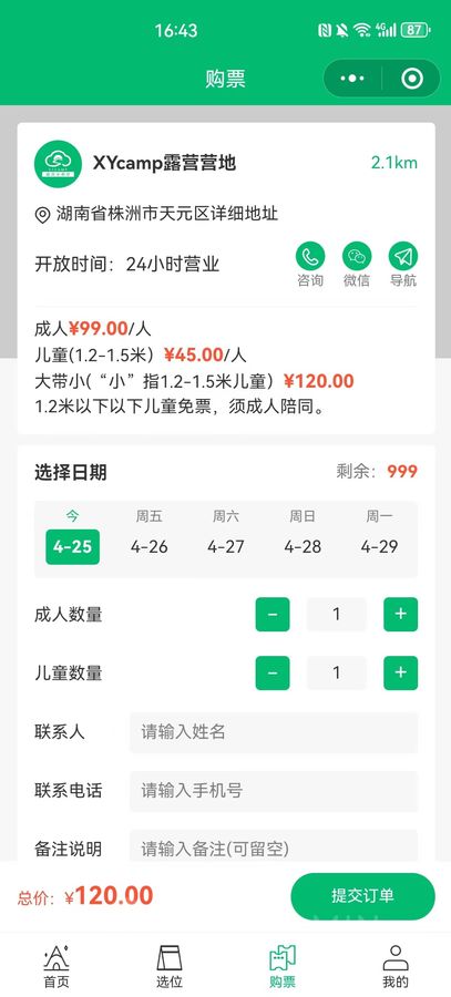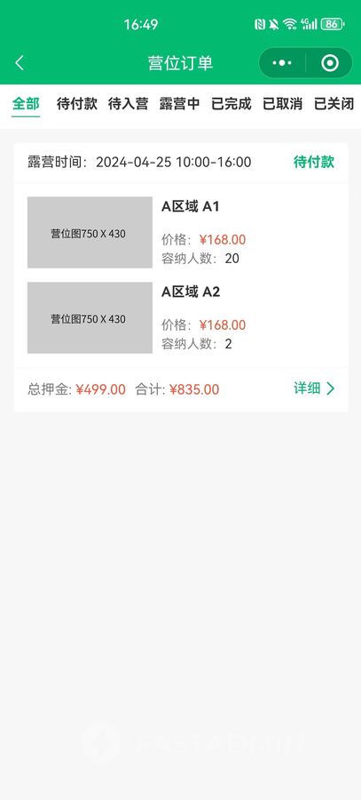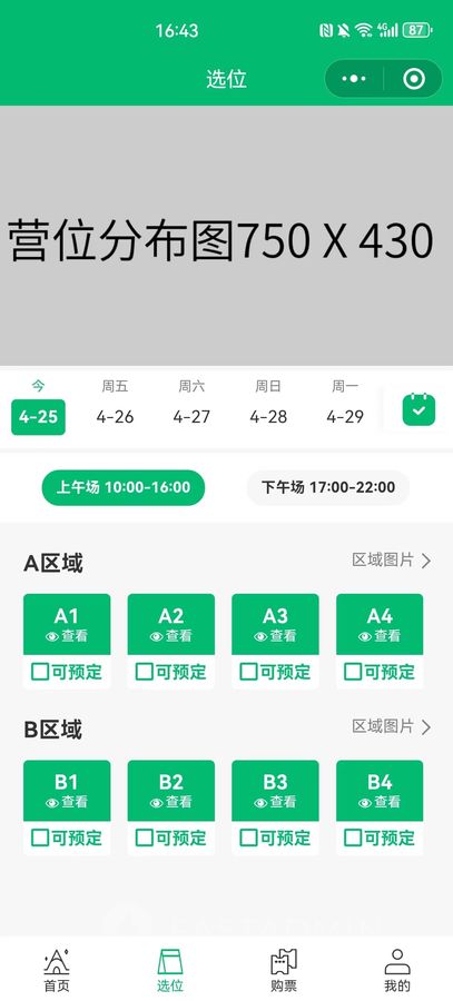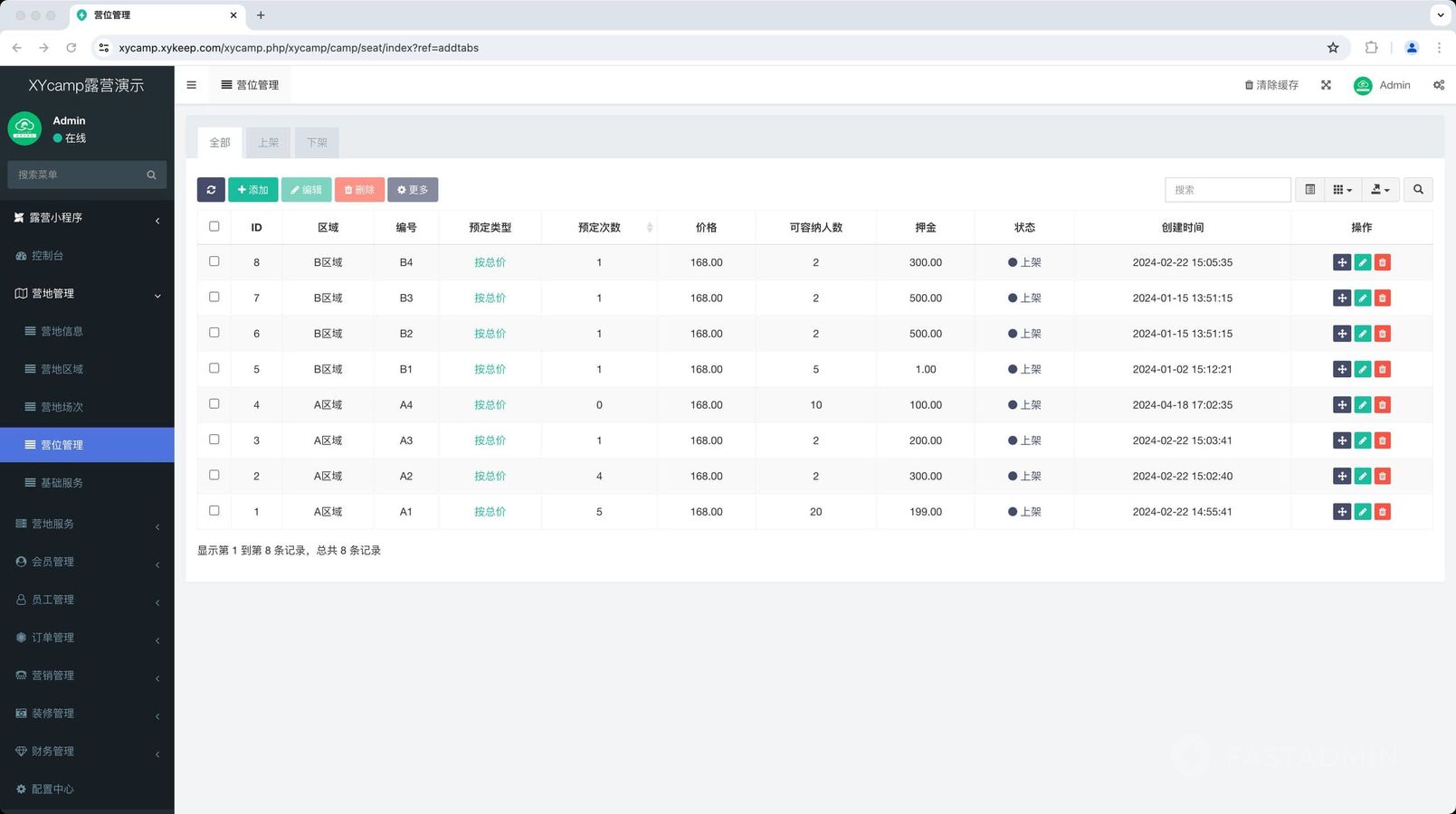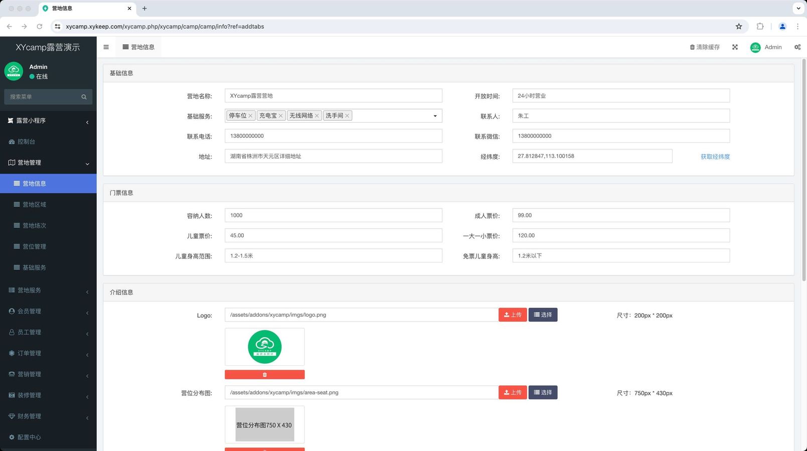 可编辑营地信息,设置营地门票价格,后台管理营地区域、场次、营位、基础服务。