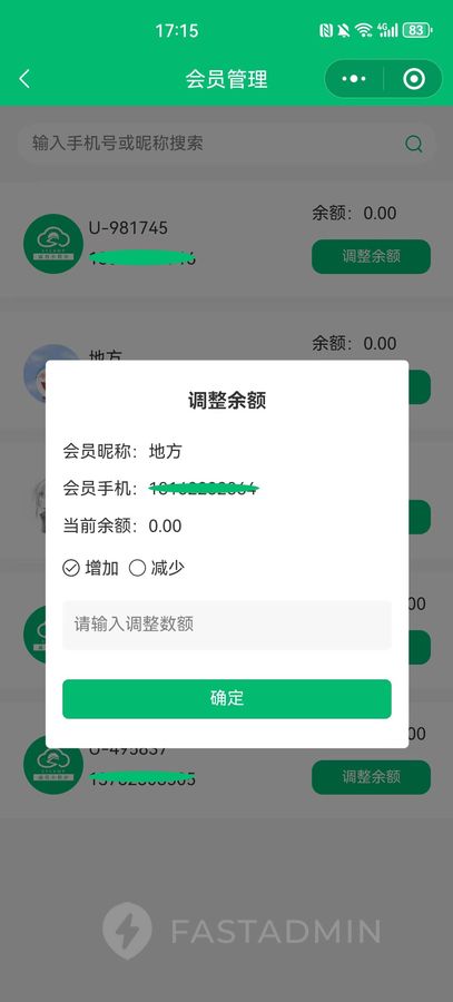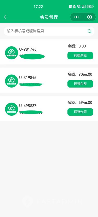 会员管理模块包含会员列表、调整会员余额、管理会员优惠券功能