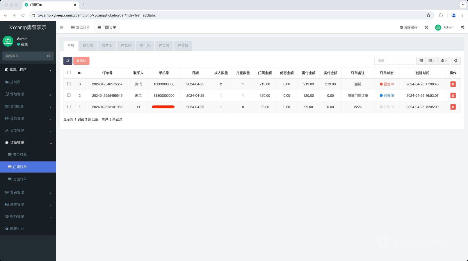 订单管理模块包含营位订单、门票订单、充值订单管理