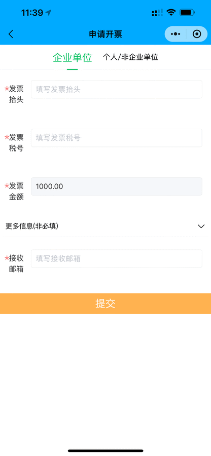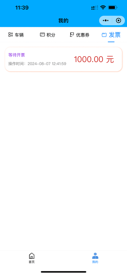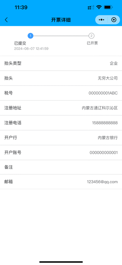 用户可在小程序直接申请开票,后台开票完成后将发送到用户预留的邮箱。