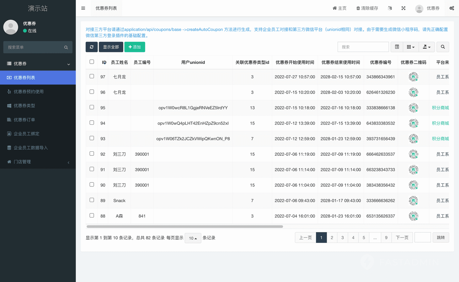 后端优惠券列表支持第三方系统对接导入优惠券,已预留相应接口,可根据实际情况做接口调整