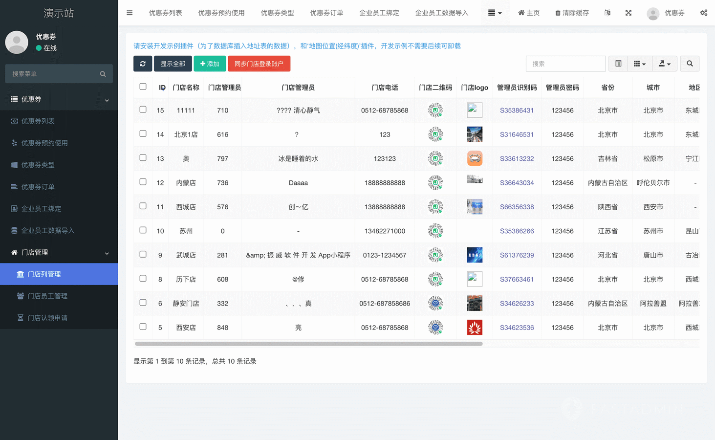 管理后台可以自定义创建门店,同时自动生成门店二维码,同时支持多门店数据批量导入