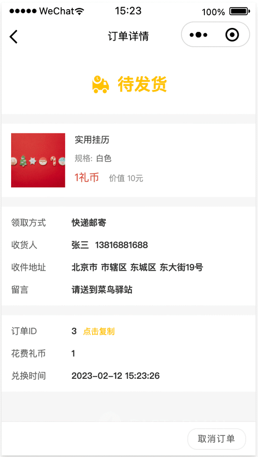 实物可以选择线下领取,也可以进行快递邮寄,在后台发货时填写快递公司和快递单号,用户在小程序就能看到物流动态
