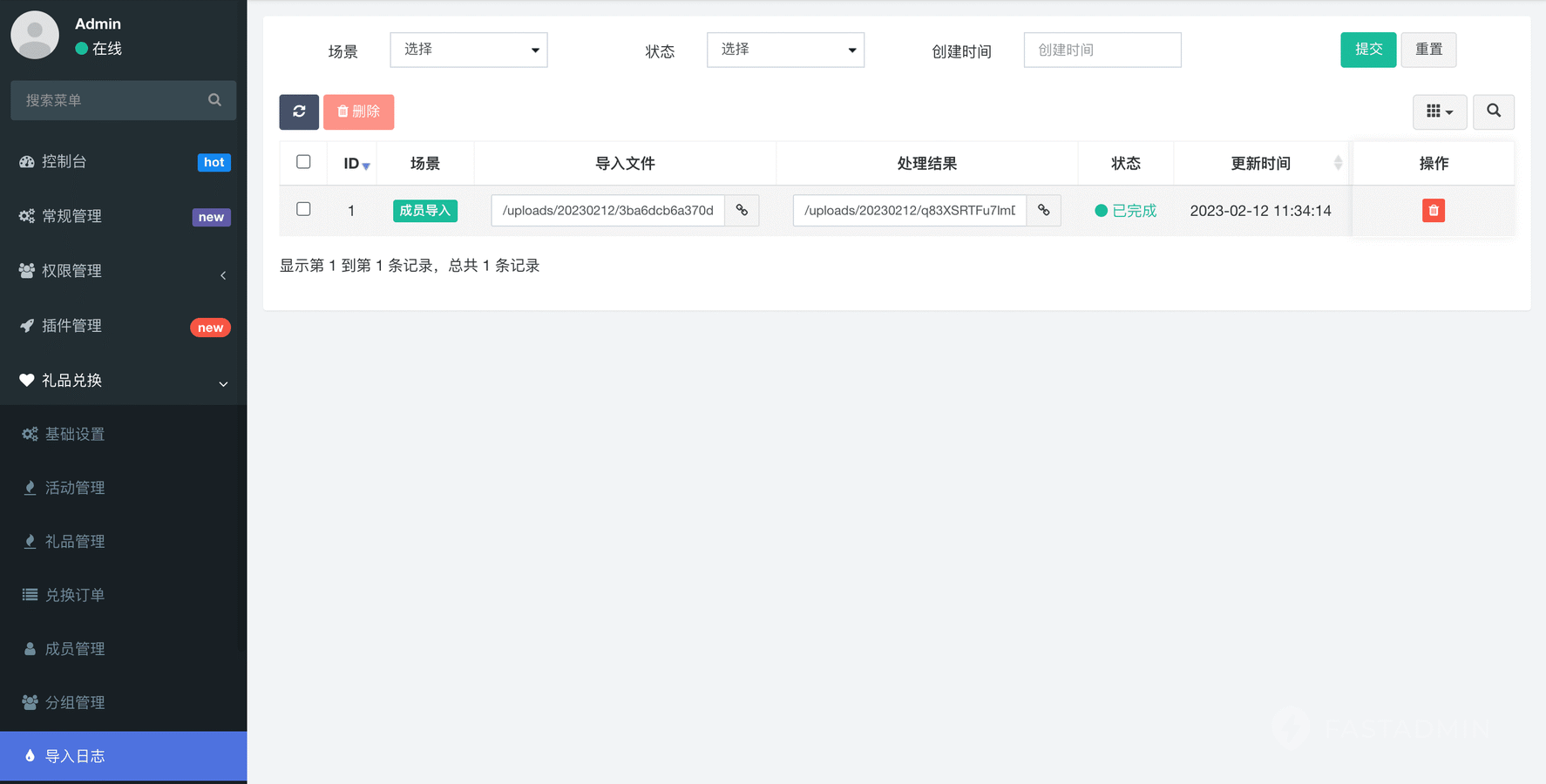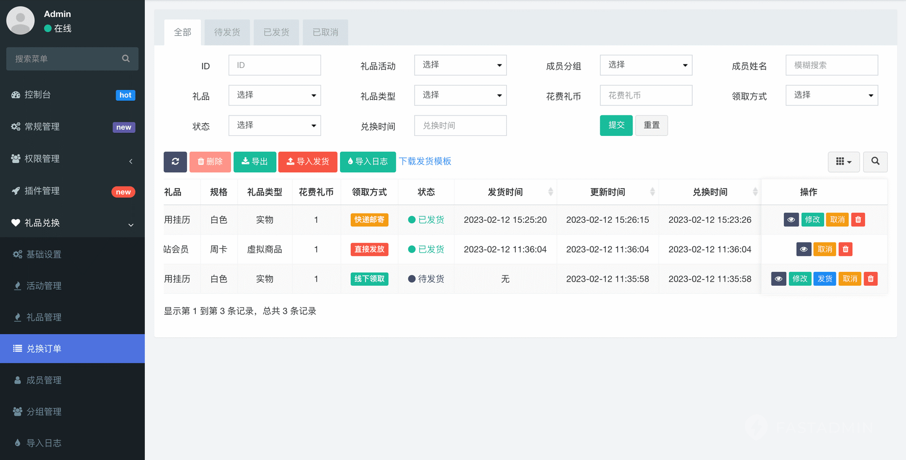 后台可以将用户兑换的实物订单导出,填写好快递公司和快递单号后,在后台进行导入,即可实现批量发货