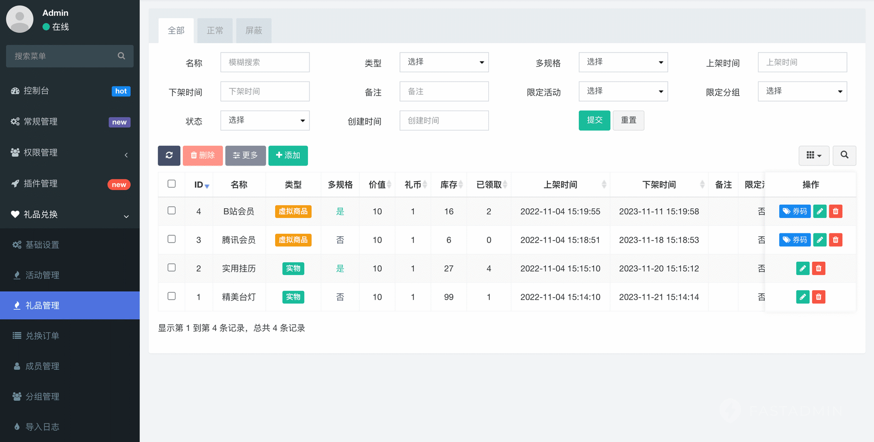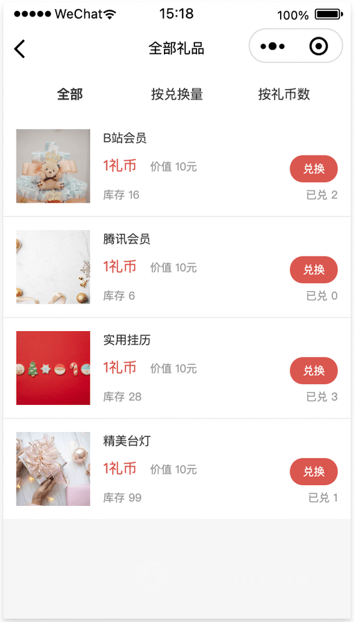 礼品支持配置多个规格,每个规格可以单独设置需要的礼币数以及库存等信息,这样用户能灵活的选择礼品规格进行兑换