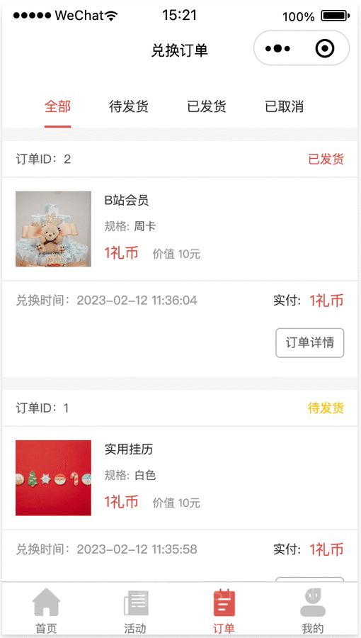 支持实物,用户领取后可在后台进行发货操作;还支持虚拟物品,比如视频会员,礼品券,用户领取后可直接显示相应券码