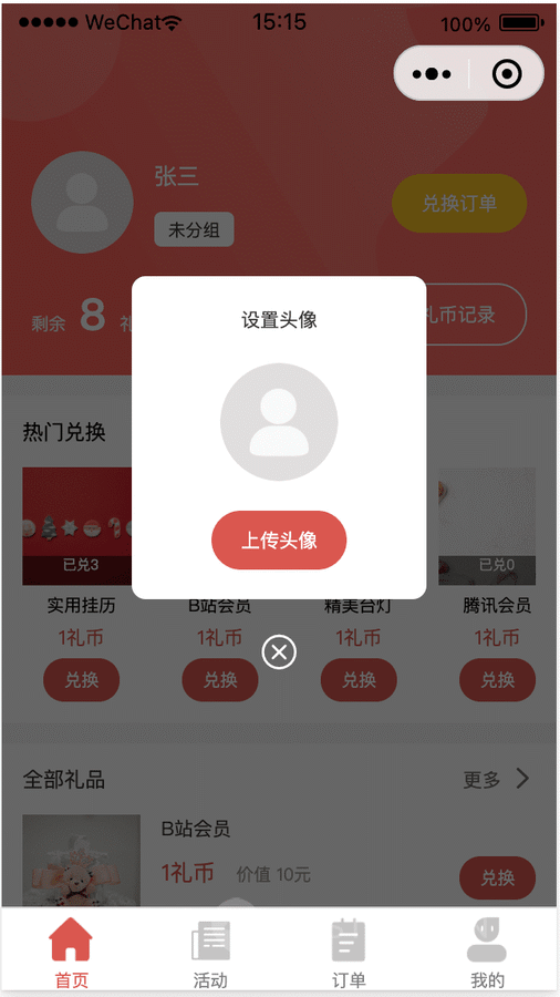 给每个活动下的用户都分配一个礼币账户,使用这个账户里的礼币进行礼品兑换,灵活性强,礼币使用记录可追溯
