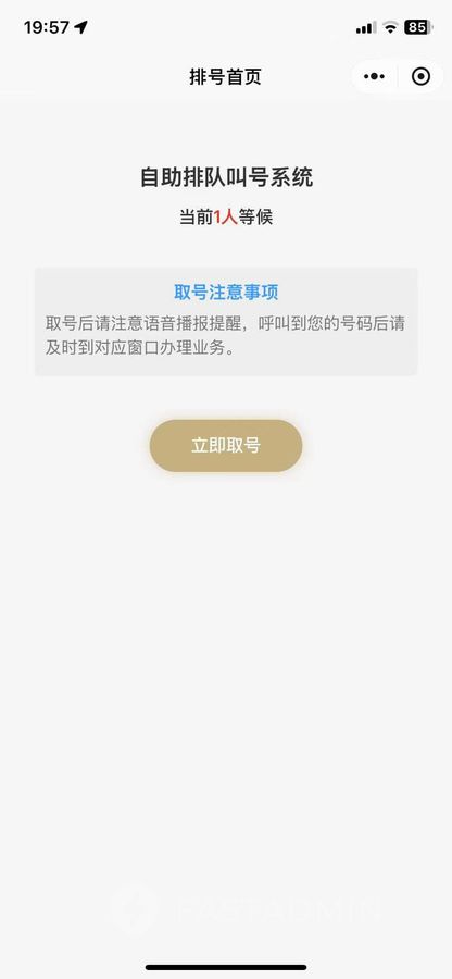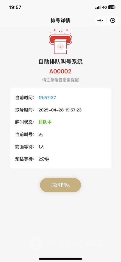 用户取号后可实时查看当前叫号,等候人数以及预估等待时长。