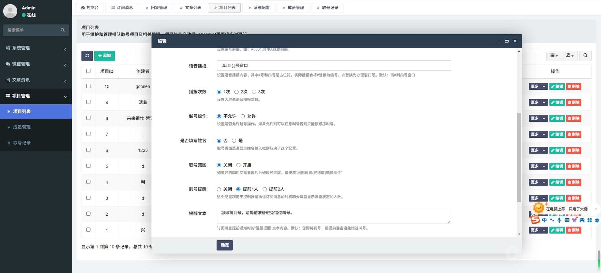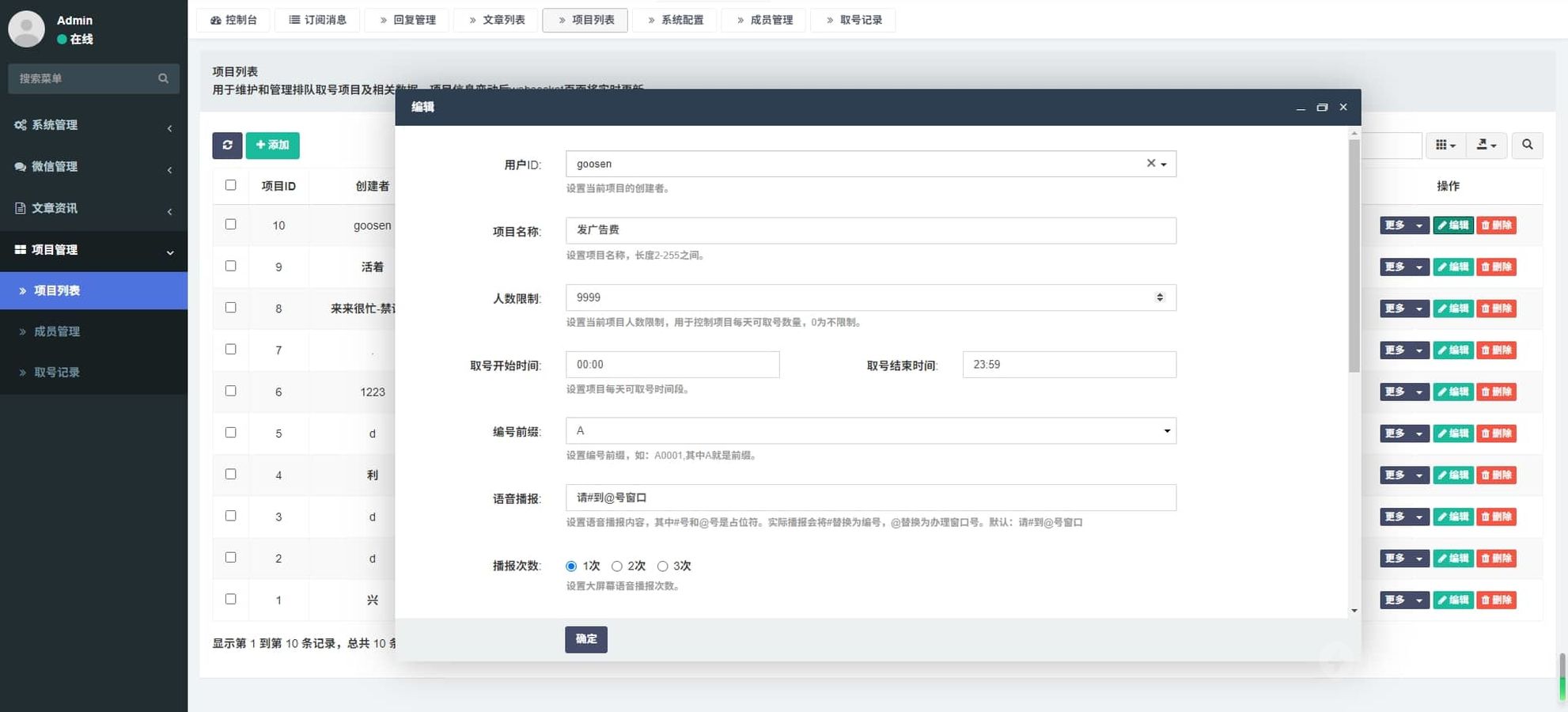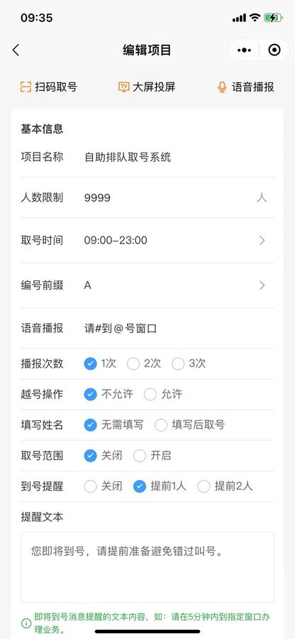 每个项目可以单独设置每日排队人数上限,超出后将不能继续取号。