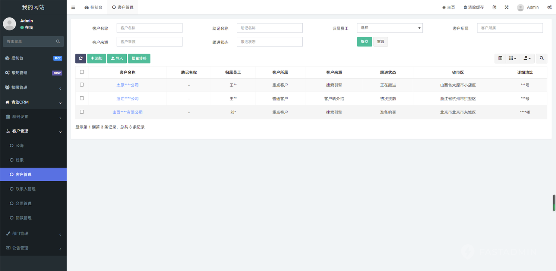 支持客户分析(地区、来源)、员工分析(客户 量、业绩)、排行(跟进、新客)