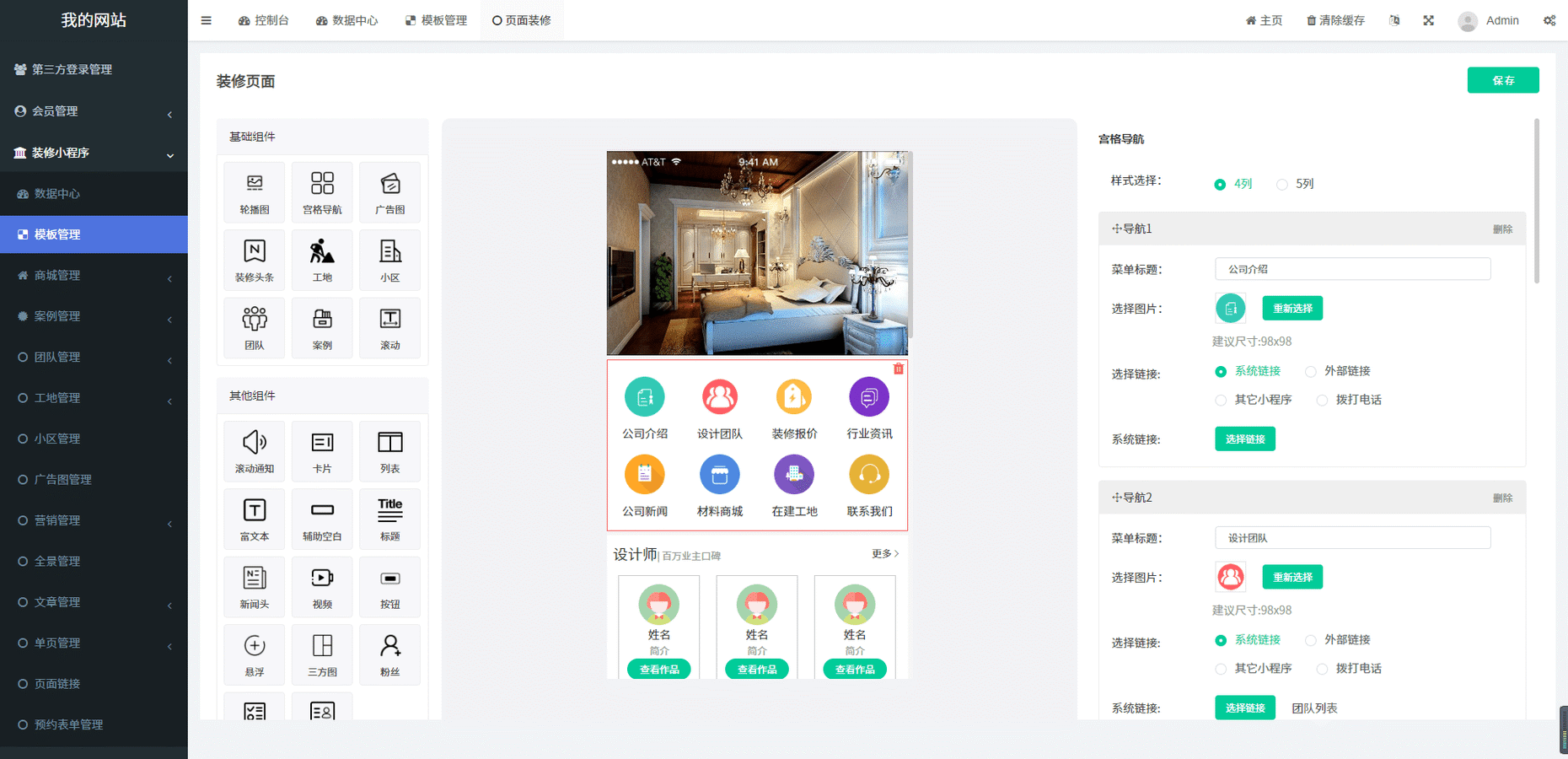 首页支持多组件拖拽布局,轮播、导航、工地、案例、团队、视频、广告、富文本、表单、围观粉丝等23个组件