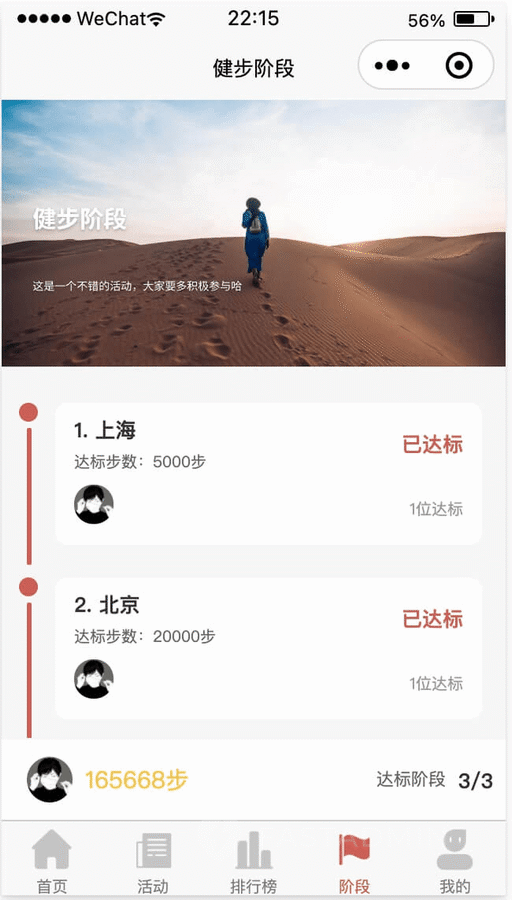 每个活动下可以配置多个阶段,完成步数达标不同阶段,比如设定318路线图的打卡点为阶段,增加趣味性