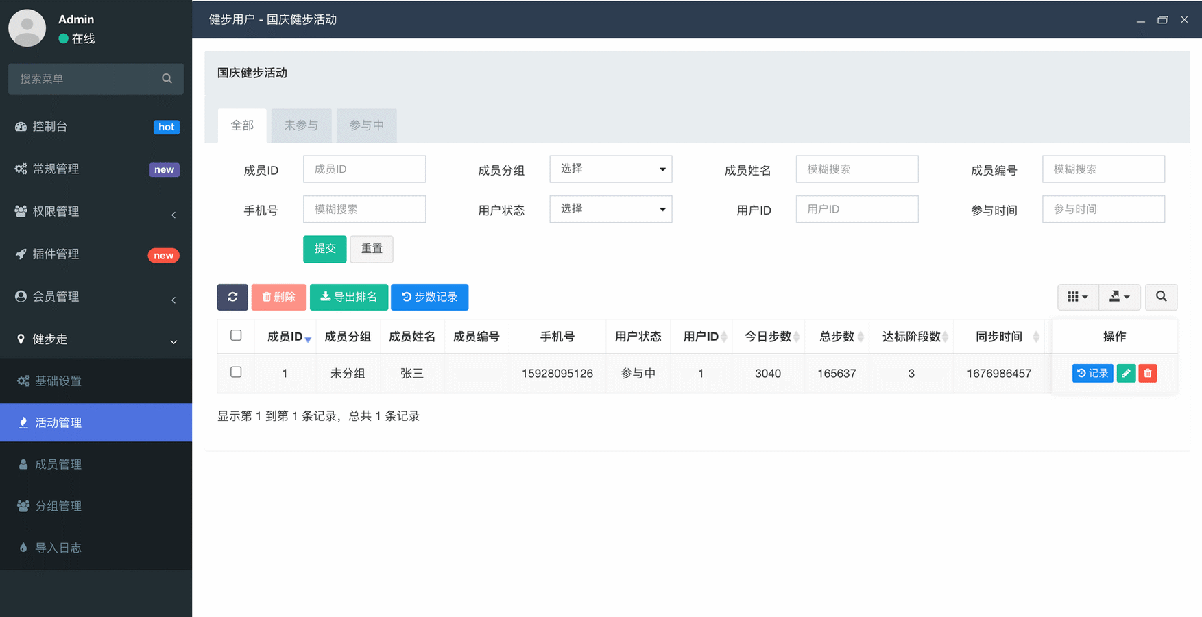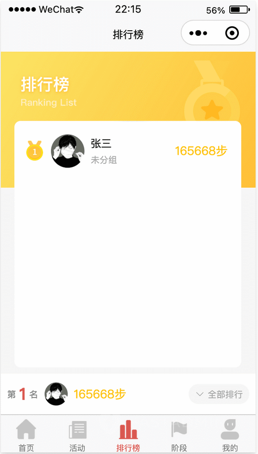 可以查看全部或指定分组人员的步数排行,这样增强用户参与的积极性,为奖品派发做参考依据