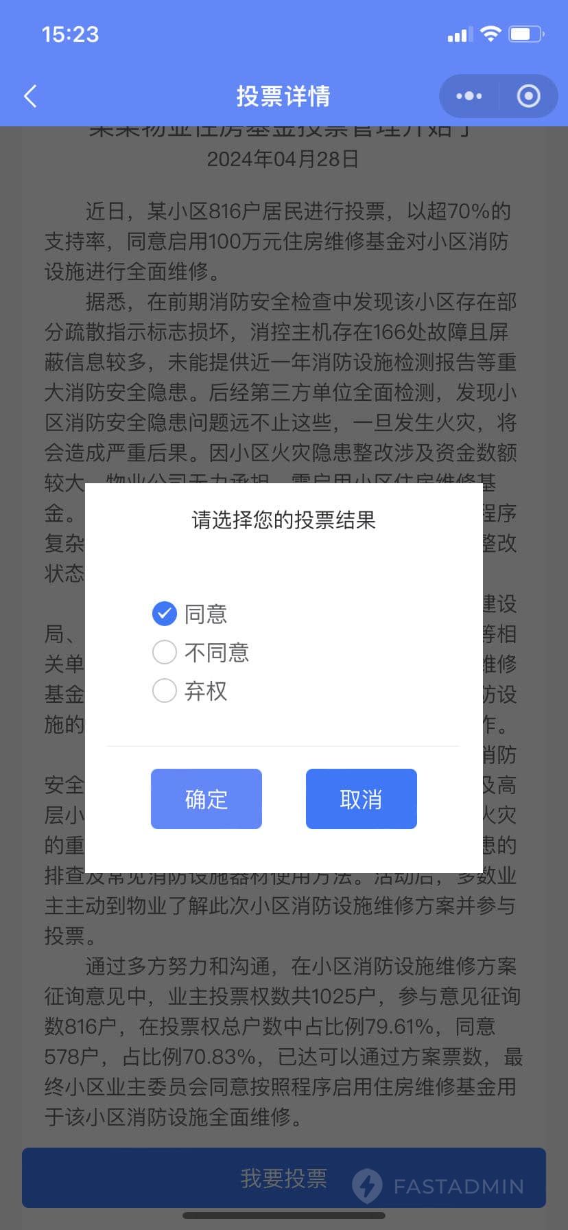 针对一些需要业主投票决议的草案,物业可以发布投票,业主在规定的时间内通过小程序投票,通过PC端查看投票结果。
