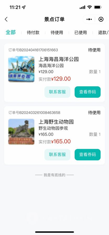 每个景点订单都有独立的核销码
