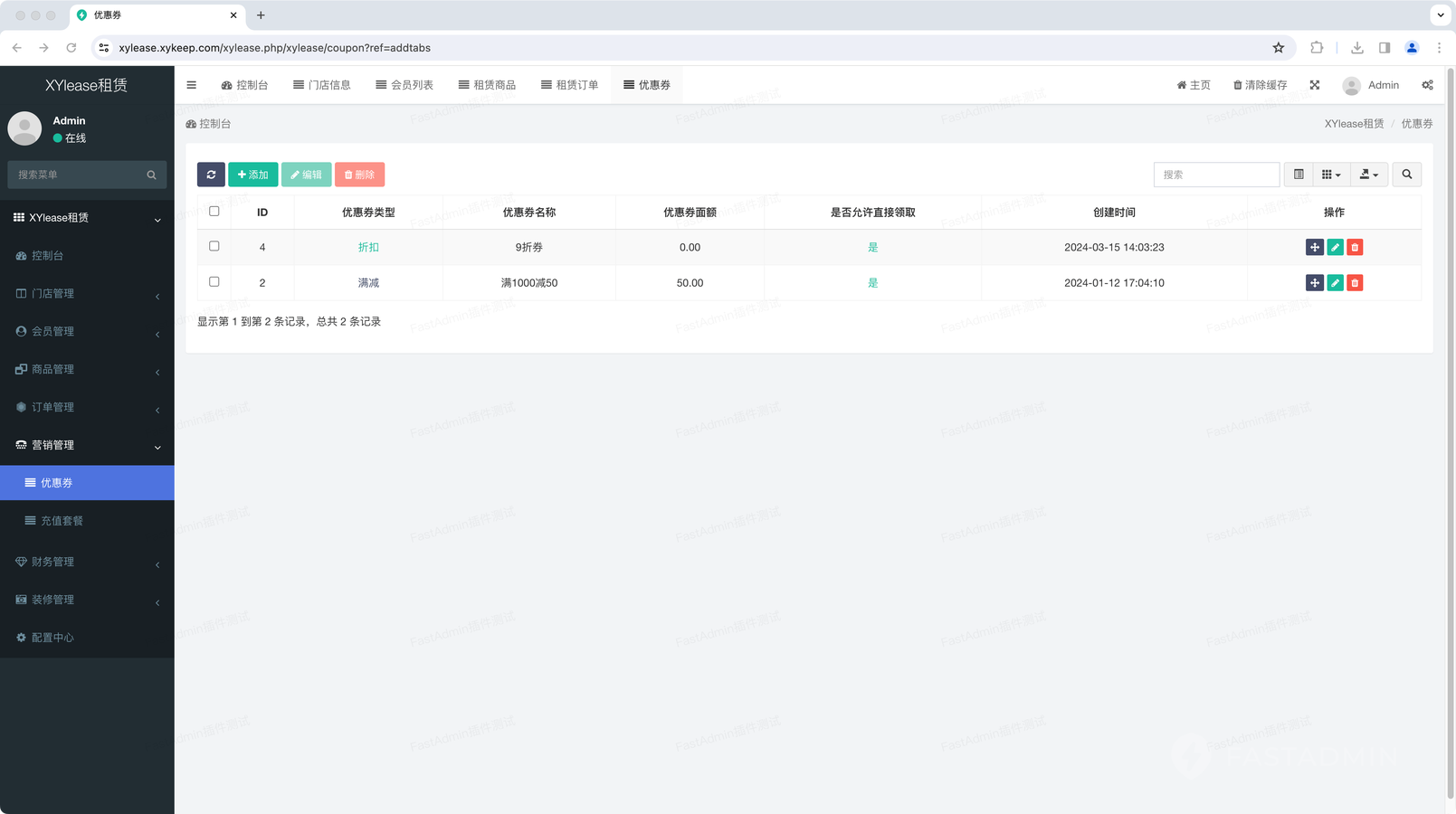 管理添加优惠券,对优惠券进行描述,后台可给会员赠送优惠券。