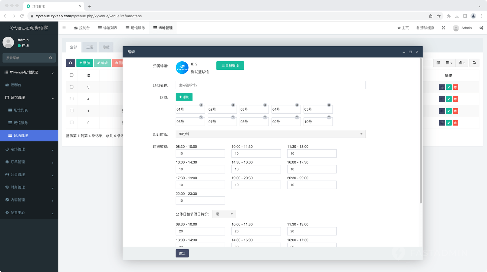 可添加多个场地,设置场地分区和时段收费,后台可区分双休和节假日特价设置。