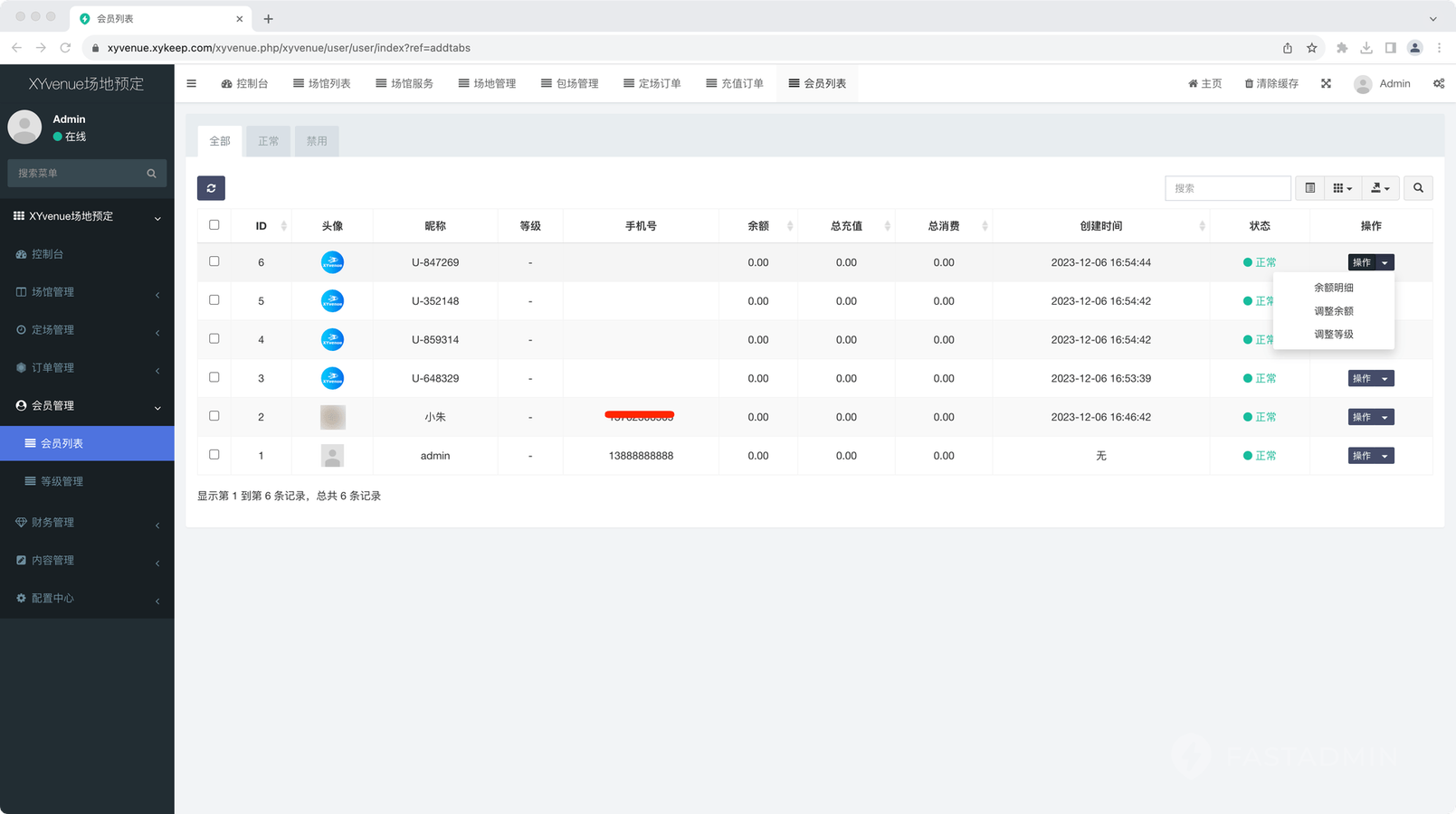 可后台调整会员余额,查看明细,退款记录。