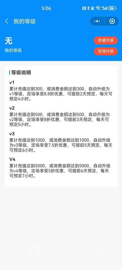 可后台设置等级,不同等级享受不同定场折扣,定场时长,提前预定天数,设置升级条件,达到自动升级。