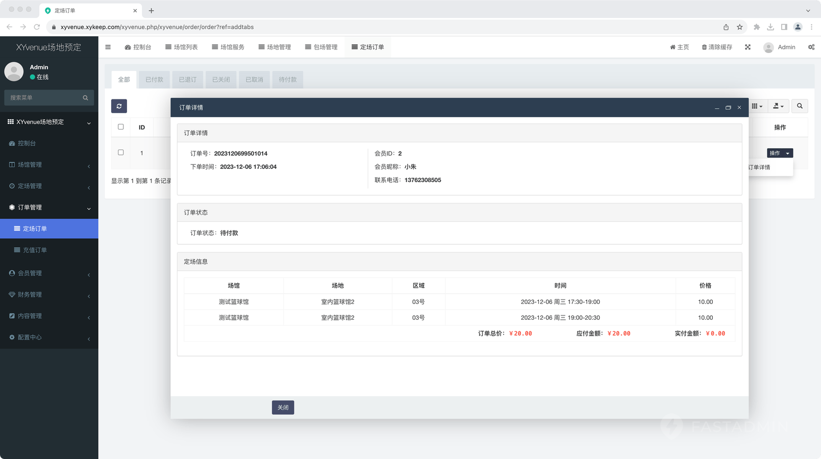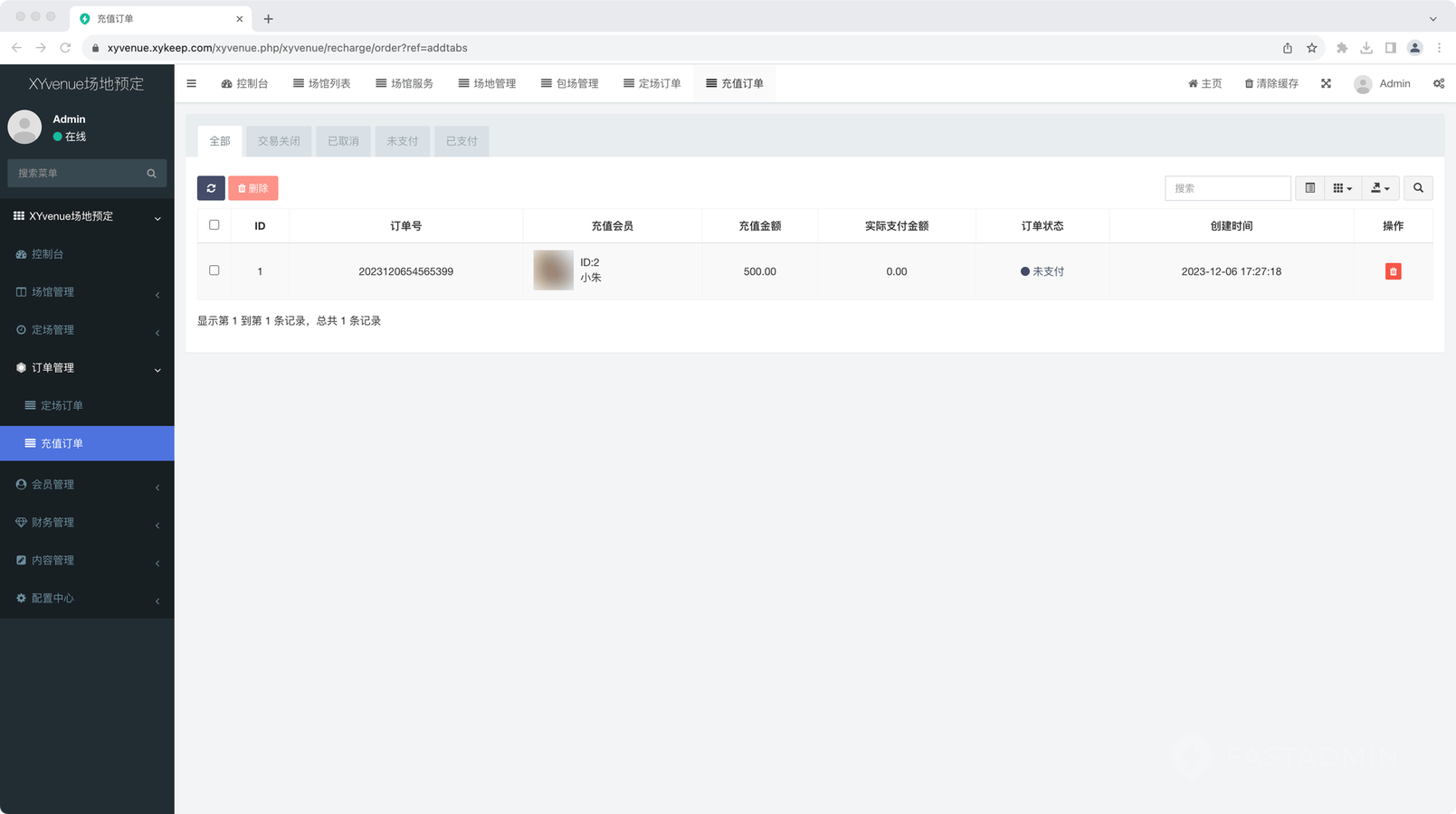 可后台查看平台订单情况,可详细了解充值订单和定场订单。