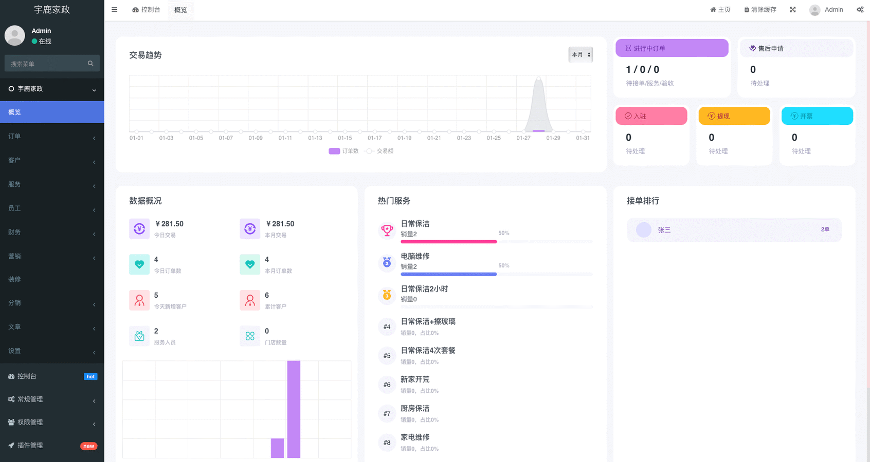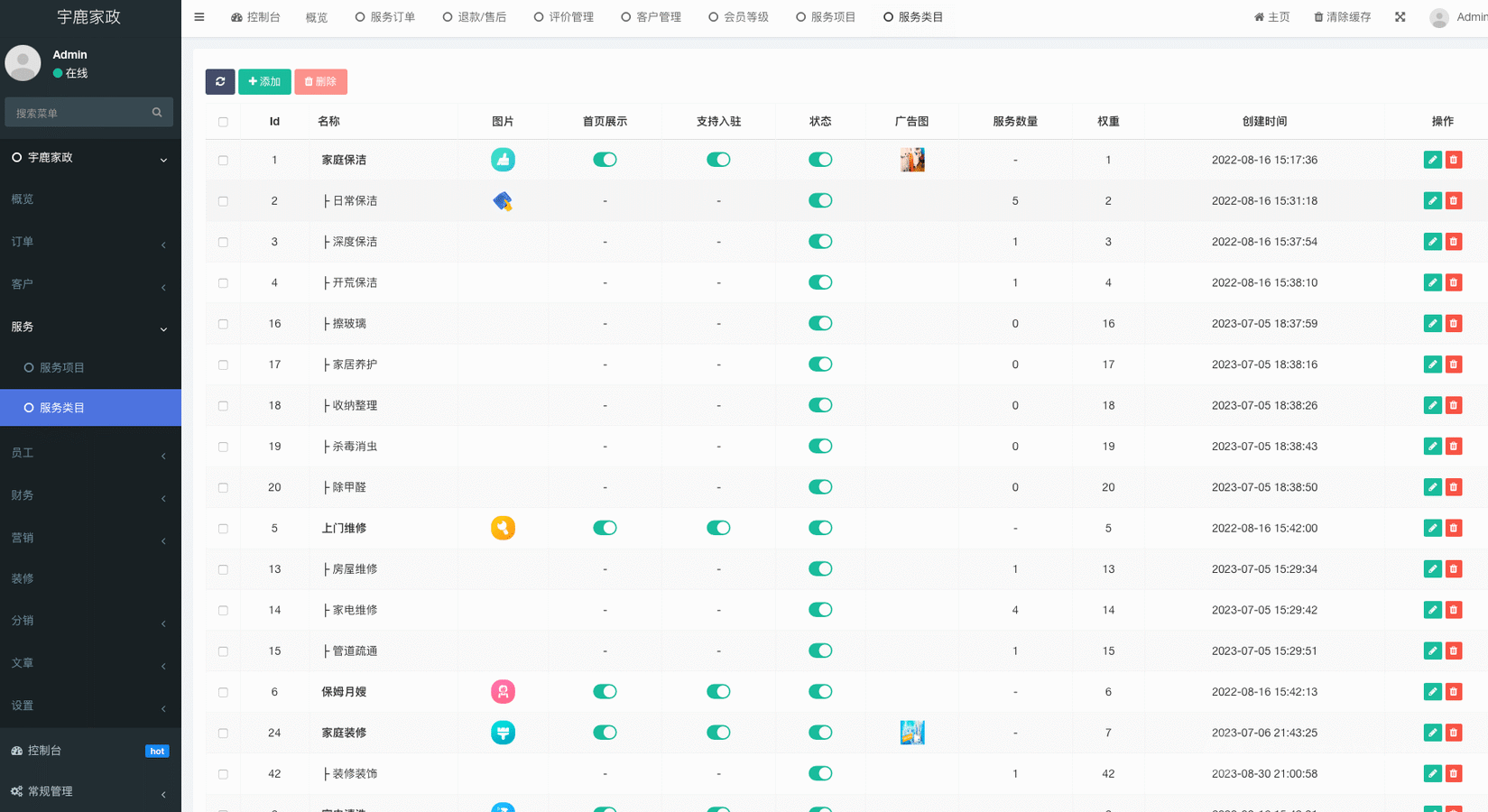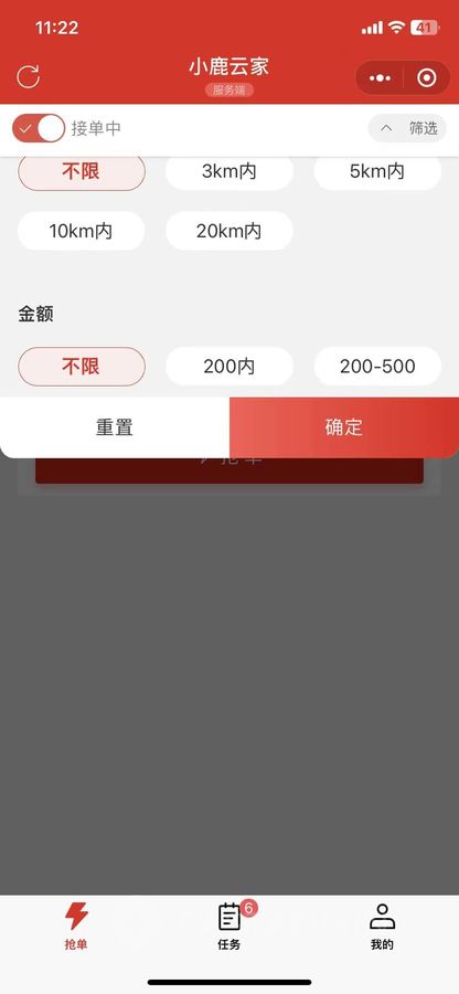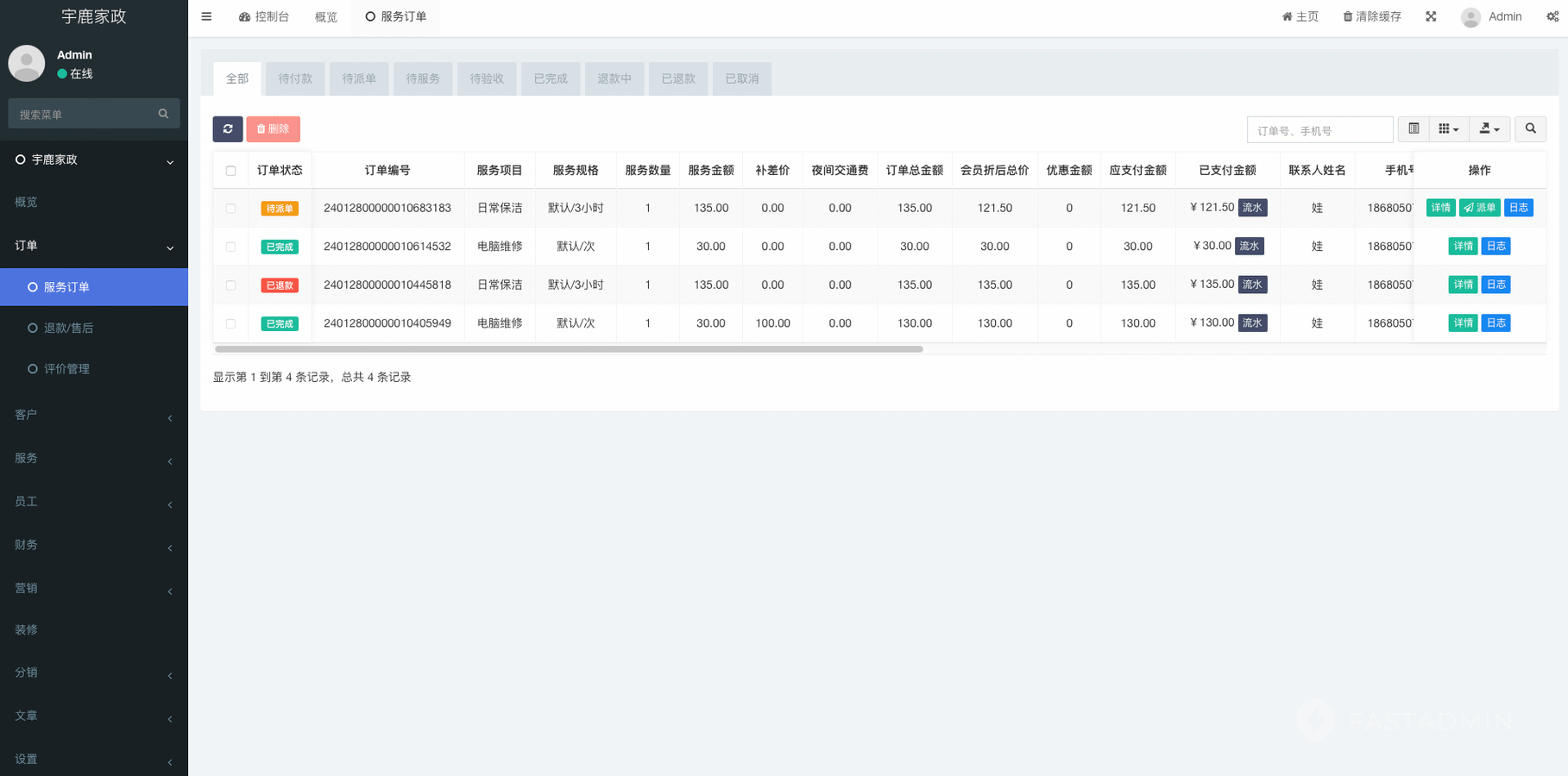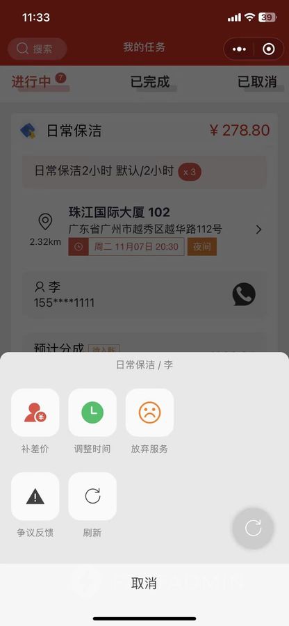 支持内部+外部服务人员登录,接单、更改预约日期、联系客户、收入提现等。