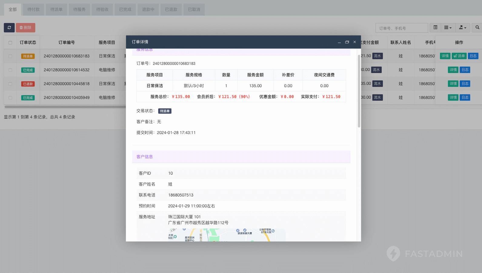 记录从下单到派单、服务、评价的全流程,实时查看服务进度